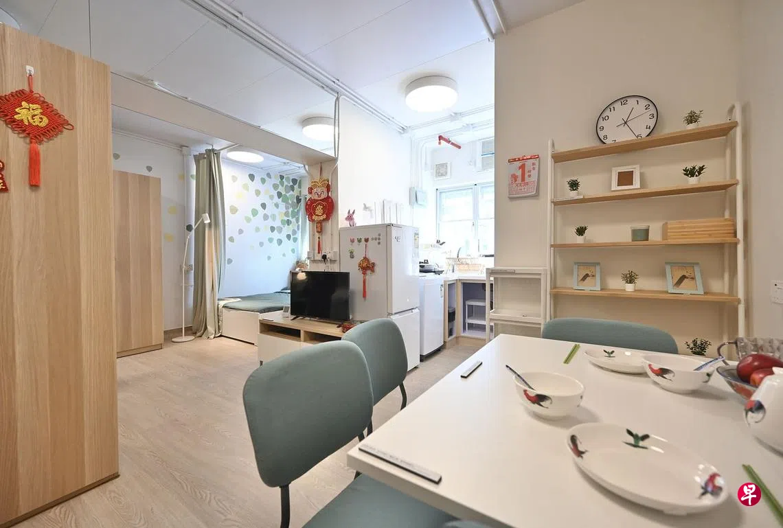 香港有超过10万户居民居住在恶劣环境的劏房,特区政府提出五年内兴建3万个简约公屋单位解困,以组装合成建筑法加快建屋速度,提供轮候传统公屋三年以上的申请者,以家庭申请者优先。在面积约300多平方尺(28平方公尺)的简约公屋单位,设有独立浴室和厨房,还有通风的窗户,适合四五人家庭入住,月租仅2650港元(约444新元),为同区新建传统公屋的九折。有消息指,港府已敲定简约公屋八幅用地的选址,其中三幅位于市区,单位占总供应一半。图为位于九龙启德的简约公屋示范单位的内部情况。