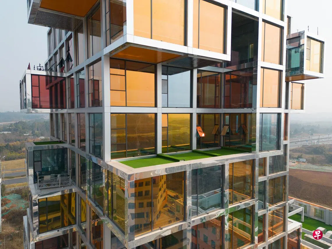 中国四川省会成都即将启用的天府文化共享中心大楼,位于天府数字文创城核心区,是一个集办公、文服、商业为一体的文化创作街区。大楼外墙由五种不同颜色的炫彩玻璃构造,从远处看众多色彩方块堆砌犹如“魔术方块大厦”。图为1月31日航拍到天府文化共享中心大楼一个个由钢结构组成的“像素盒子”,在阳光下熠熠生辉。(香港中通社)