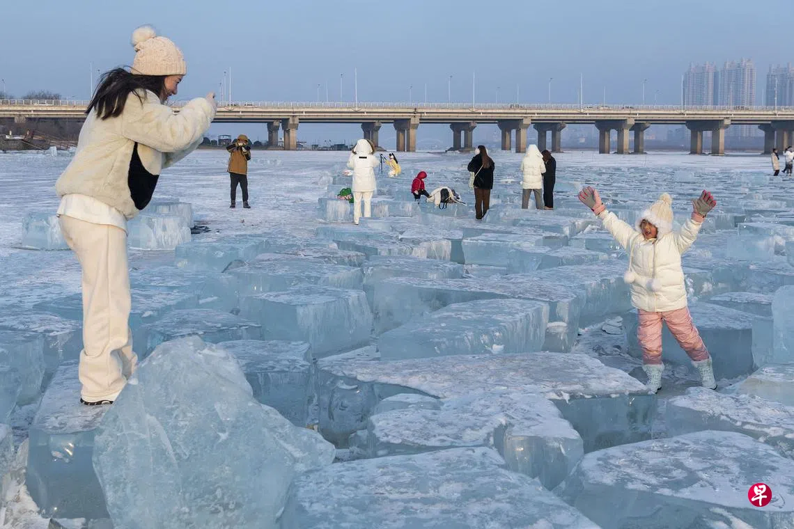 游客星期三(2月1日)在松花江哈尔滨段江畔的“钻石海”游玩。时下,中国“冰城”哈尔滨市正值冰雪旅游黄金季。松花江哈尔滨段江畔曾是哈尔滨冰雪大世界采冰区域的一片封冻江面,因散布晶莹的冰块,被游客称为“钻石海”,成为哈尔滨新的旅游打卡地。