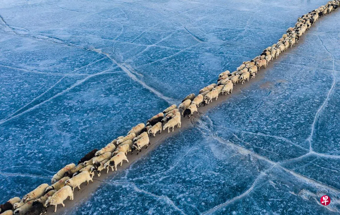 西藏山南市浪卡子县推瓦村的1400多只羊2月3日通过普姆雍措冰湖,前往湖心岛。
