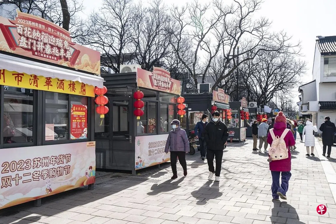 在江苏苏州,地方政府将空置的核酸检测亭改造成春节市场摊位,免费提供给商家,用来售卖特色农产品和当地小吃等。苏州当地官员说,这些亭子将继续供商家使用,促进消费和旅游业的发展。