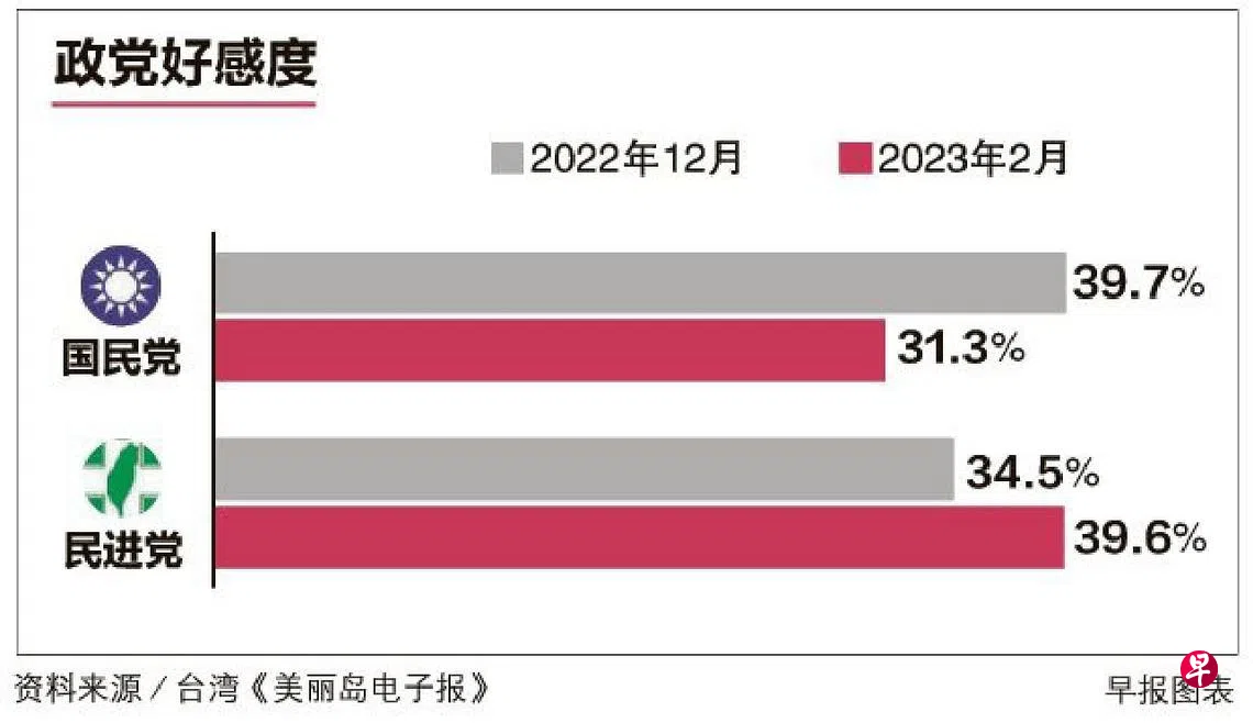 网络媒体《美丽岛电子报》星期一(2月20日)公布2月民调,值得关注的是,去年11月26日“九合一”地方选举大胜的国民党,政党好感度从选后12月的39.7%高峰直坠到31.3%,民进党则从34.5%上扬至39.6%。国民党两个月内从领先到落后,一来一往跌了13.5%。
