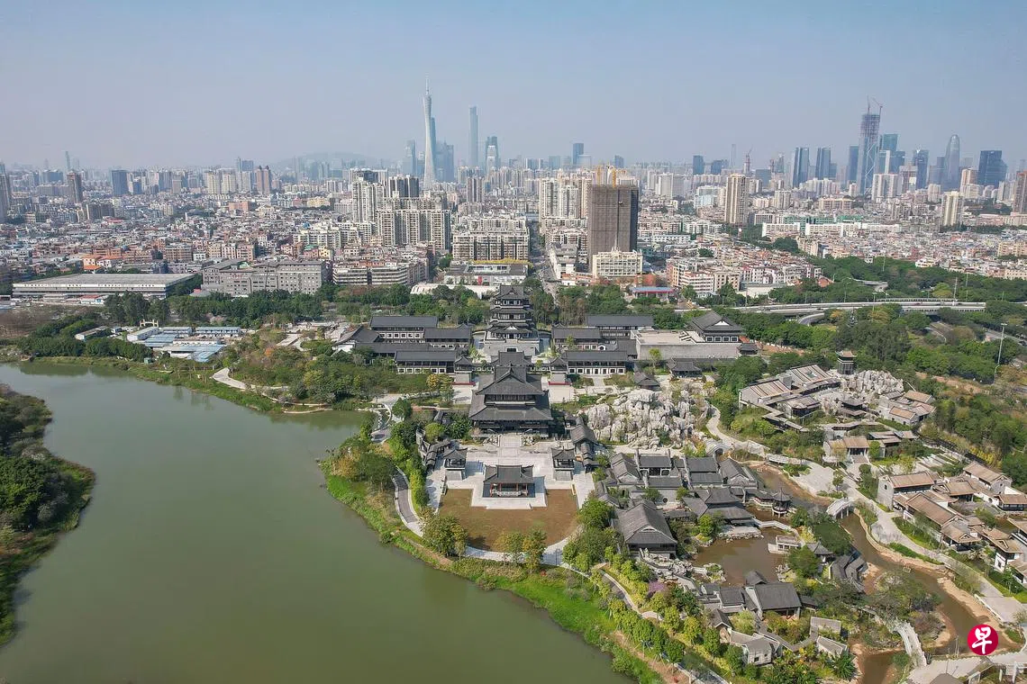 广州文化馆新馆以“十里红云一湾水,八桥画舫十六亭”为设计主题,用传统建筑和园林空间的组合再现岭南水乡园林的佳境,包含公共文化中心、翰墨园、曲艺园、广府园、广绣园等多组主题园林建筑,以及由它们共同形成的大型园林景观。图为2月22日航拍的广州文化馆新馆。