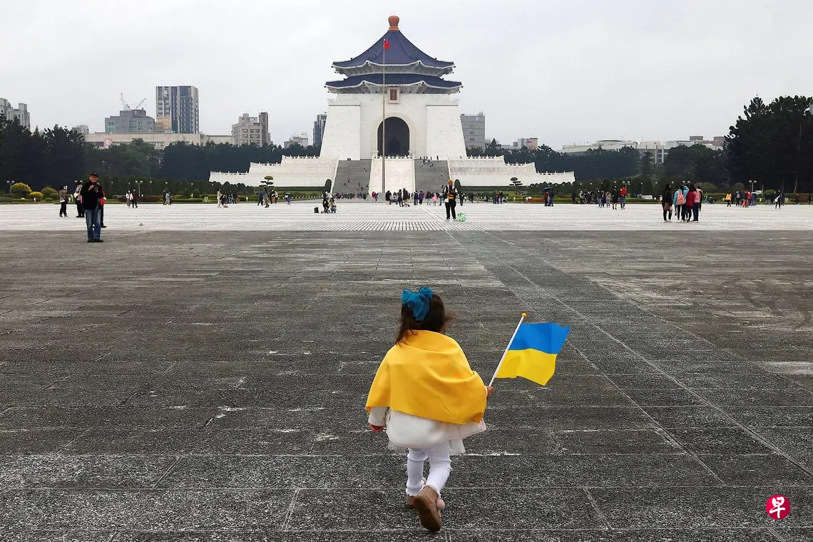 俄乌战争满一周年,台湾乌克兰阵线星期六(2月25日)在台北自由广场举办“台湾与乌克兰同在”活动声援乌克兰,通过唱乌克兰国歌、默哀战争死难者、演讲等彰显台湾对乌克兰的支持。出席者除了在台乌克兰人,还有时代力量新任党主席、立委王婉谕、台北市议员苗博雅、民进党国际部主任谢佩芬、台权会秘书长施逸翔等台湾政治人物。图一为小女孩举着乌克兰国旗走在自由广场上,图二为小男孩与出席“台湾与乌克兰同在”活动的人士互相击掌打气。(路透社)
