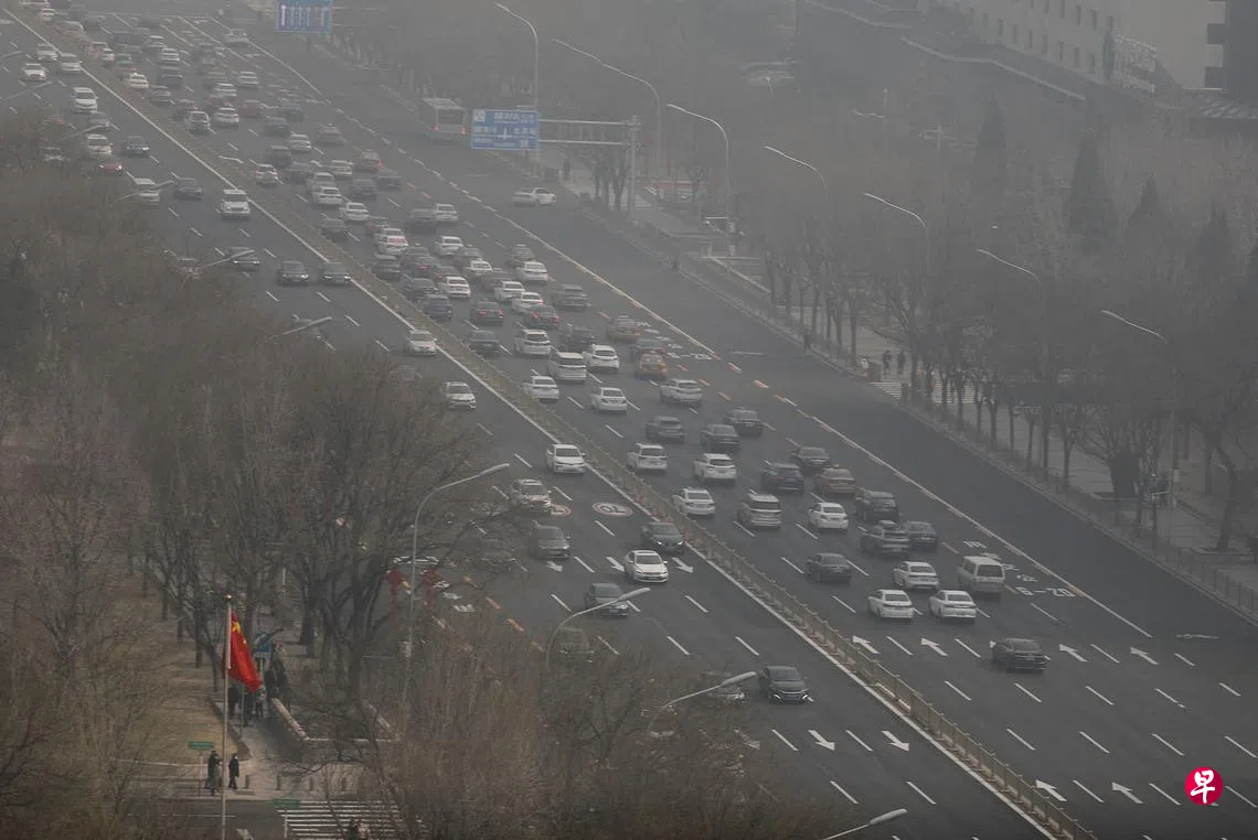 图为在雾霾天气下,在北京道路上行驶的车辆。(路透社)