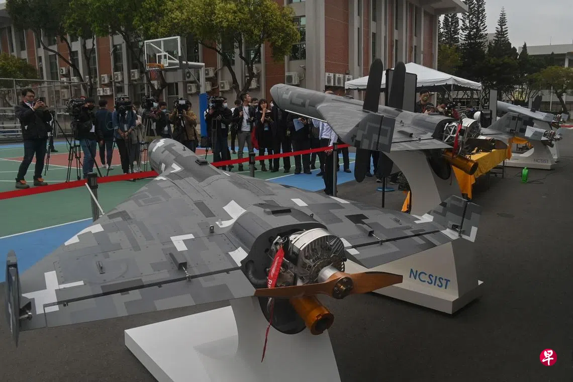 (台北综合讯)在台海局势趋于紧张之际,台湾中山科学研究院罕见展示了九款已量产及研发中的侦察搜索与攻击无人机,包括首次亮相的“台版弹簧刀”巡导弹无人机,并强调这是构建台湾的不对称战力。