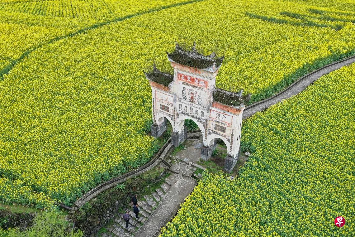 长碛古寨位于中国贵州省遵义市凤冈县新建镇,三面环水,民居依山而建,面积约8平方公里,由龙塘溪、马鞍渠、庙坝、长碛、杨塘等5个自然村寨组成。古寨始建于元末明初,历经700余年风雨洗礼,因洪渡河携带大量泥沙冲积成扇坝而得名。当地村民对自然怀有崇敬之情,努力维护人与自然的和谐。长碛古寨绽放的油菜花与河流和民居交相辉映,遗存的清嘉庆“圣旨”旌表并由龙泉知县题联的“谢氏节孝坊”、清光绪年间“禁止捕鱼碑”“朱氏宗祠”“上衙下衙”“回音壁”“打板沟”等形成了独特的人文自然景观。其中,“谢氏节孝坊”历经风雨200余年,体貌大体完好,雕刻工艺以高浮雕为主,内容有人物、动物、植物等吉祥图案,加之楹联“苦节抱孙千载蒸尝欣有托,养志如子毕生孝义永无亏”,记述那个时代贞孝节义的一段往事,具有较高的史料价值和建筑艺术价值,是为长碛的标志性建筑。图为3月17日“谢氏节孝坊”四周的油菜花田。(中新社)