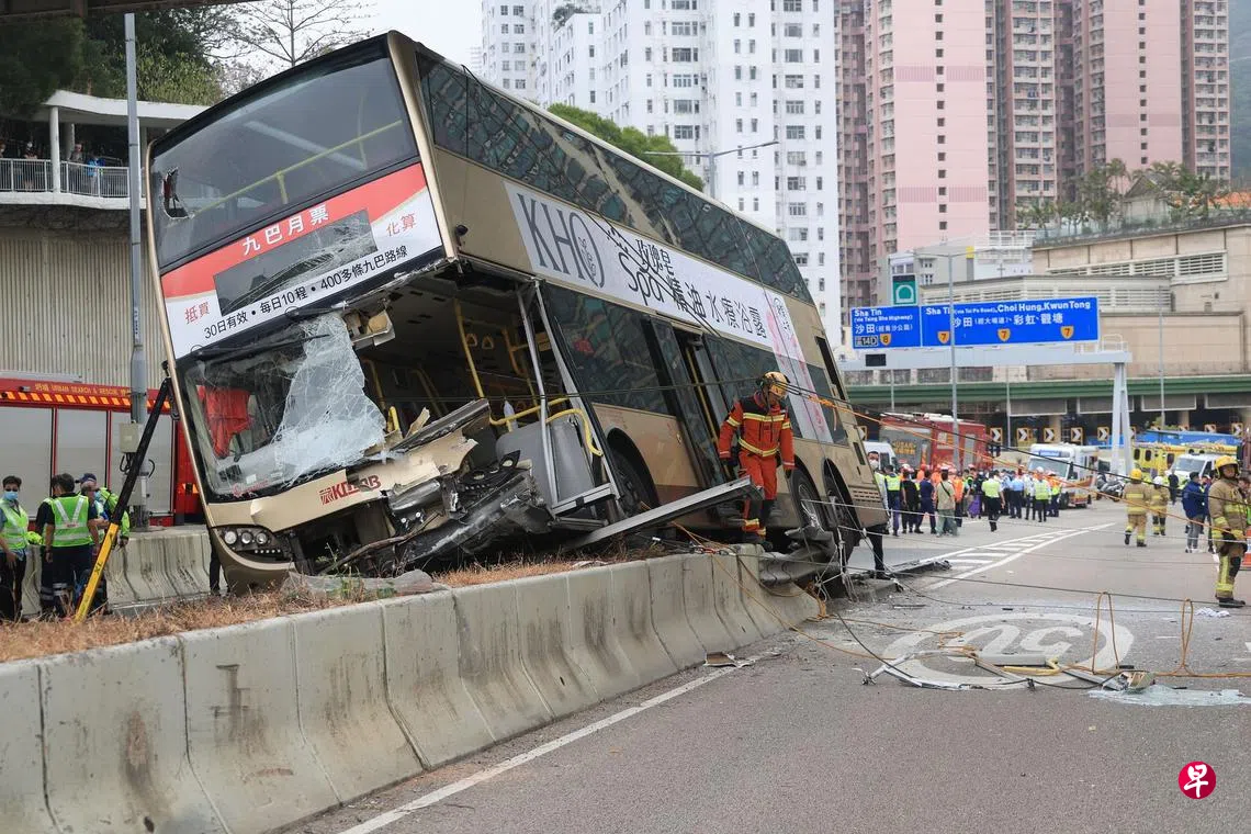 香港九龙巴士公司的一辆双层巴士,星期一(20日)上午9时42分从九龙半岛的将军澳前往荃湾西站,驶至呈祥道时突然失控猛撞路中分界堤,巴士左边车头被削开毁烂,挡风玻璃碎裂,左边车身搁在石堤上。该辆巴士失事时连同巴士车长,全车约有77人,当中上层55名乘客一度被困,部份人撞损受伤流血。消防人员耗时约1小时将乘客逐一救出,44人受伤送院。警方表示涉事巴士车长涉嫌危险驾驶被捕,正调查其驾驶态度、过往定案记录、精神状况及当时车速,车长在现场能与警员对答。图为巴士撞上分界堤倾侧,车头和车身严重受损,警方和消防人员及时赶往现场将所有被困人士救出。( 香港中通社)