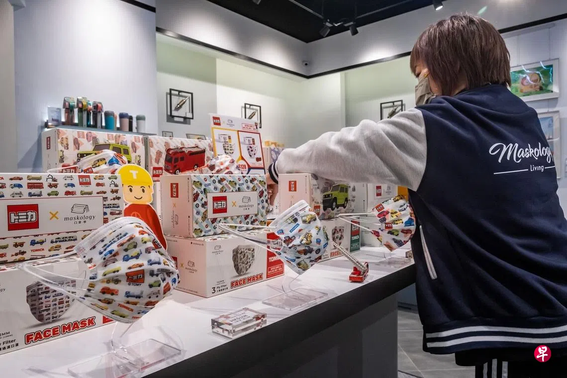 香港自3月1日起停止实施强制戴口罩措施,但大多数港人行走在大街上和搭乘大众交通工具时,仍然戴着口罩。图为3月16日香港口罩制造厂商Maskology的一名职员,正在整理店里架上的口罩,以等候顾客上门购买。Maskology早前已决定做好品牌形象,主攻价格稍高的口罩市场,希望吸纳对口罩有要求的客人。(彭博社)