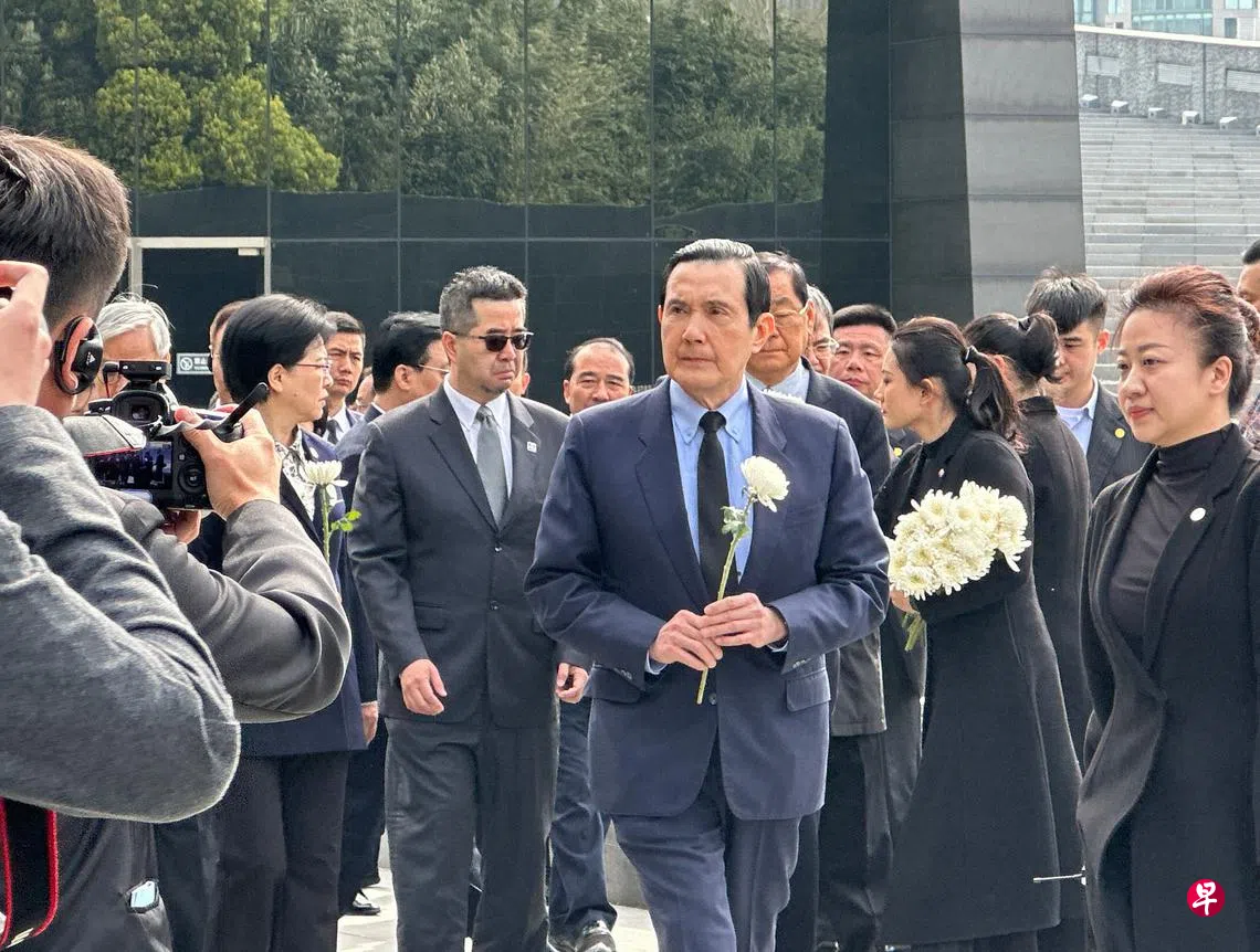 访问大陆第三天,马英九29日上午身穿深色西装配戴黑色领带,率团前往侵华日军南京大屠杀遇难同胞纪念馆参访。进馆前,他手持白菊,在遇难者纪念墙前献花、默哀致祭,随后进馆参观。