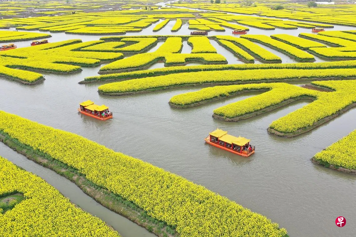 江苏兴化千垛菜花风景区,又称兴化千岛菜花风景区,以“垛田”特色地貌享誉全球。每年清明时节,千垛景区四面环水的“垛田”上,长满了金黄色的油菜花,当地通过推出多种赏花活动,聚集旅游人气,发展“赏花经济”。近日,兴化千垛菜花风景区油菜花次第开放,吸引大批游客前来赏花游玩。图为该风景区3月29日“垛”上花开春意浓,吸引游客乘坐画舫欣赏两岸油菜花。(新华社)