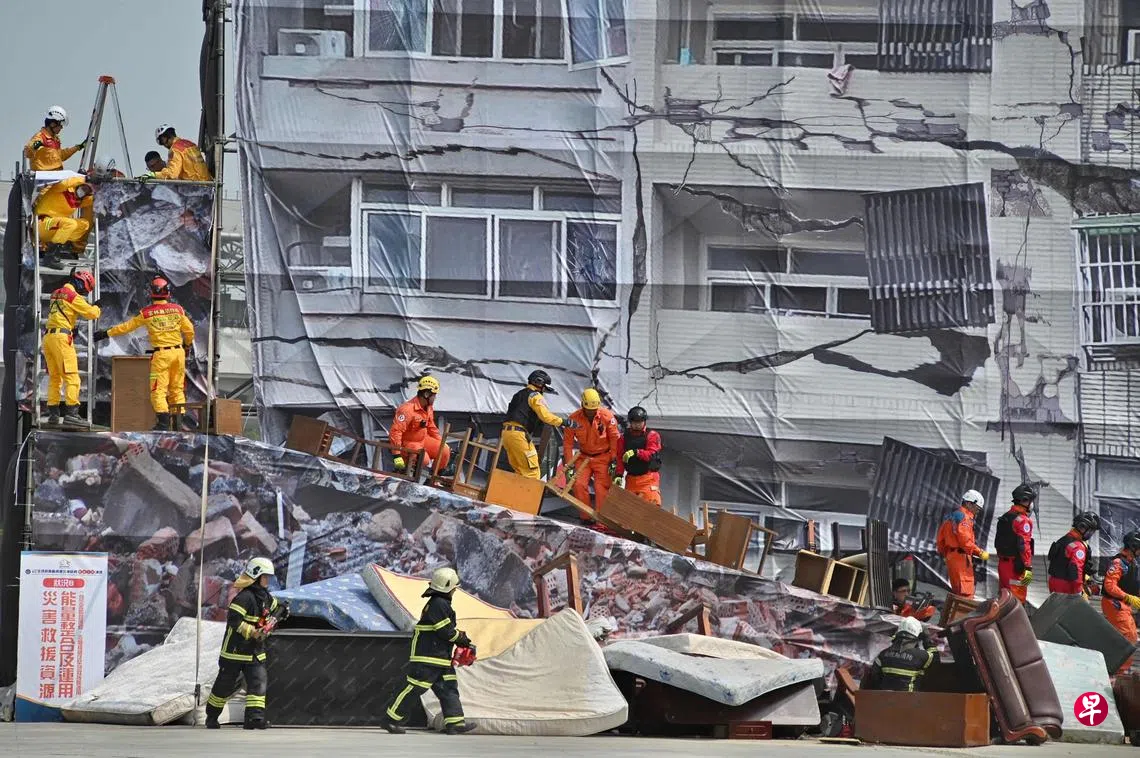 图为台中市的演习于星期四(13日)率先登场,救援人员在模拟倒塌的大楼废墟搜救生还者。(法新社)