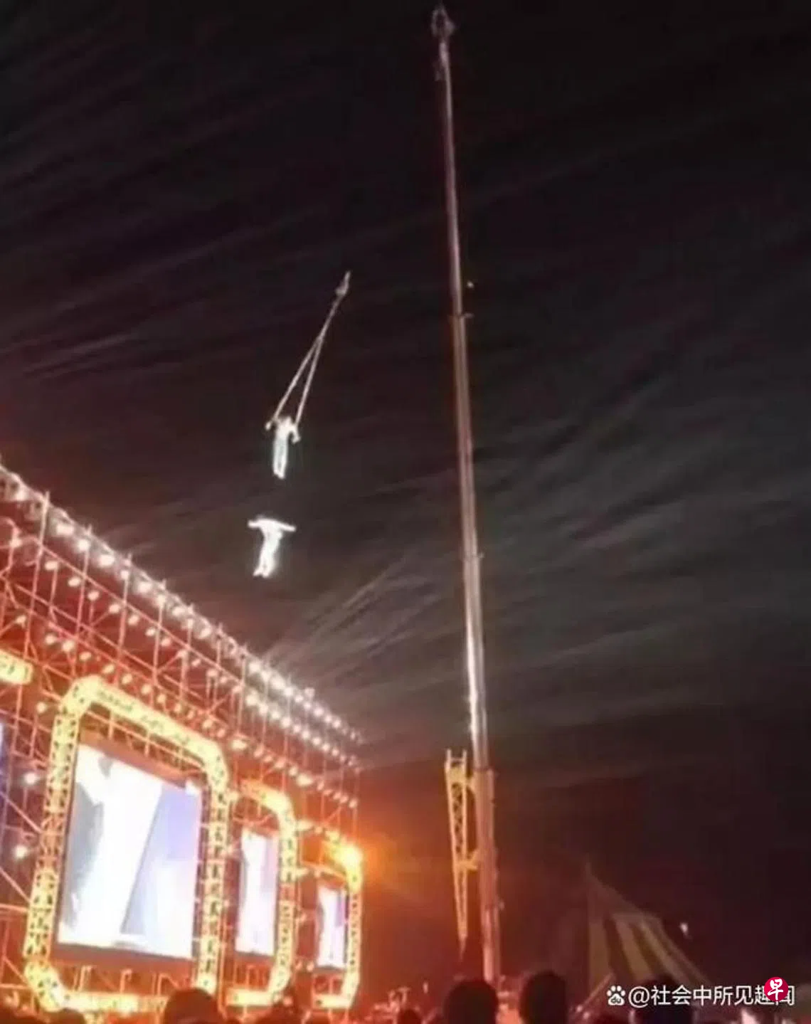 网络流传事发经过的视频画面显示,一对男女杂技演员当时正在一个户外舞台进行高空表演,他们正抓住一个吊环,被起重机吊到空中。