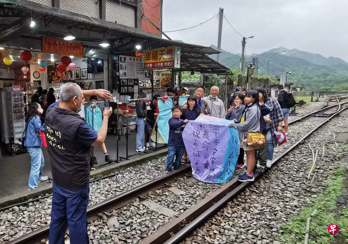 星期天(4月30日)中午,新北市平溪老街的十分火车站旁,挤满放天灯的游客。