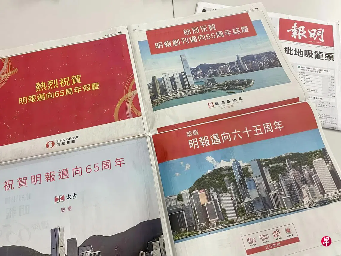 据网媒“光传媒”报道,香港社会各界星期五(5月19日)在《明报》刊登了33版庆贺广告,广告内用词皆为“迈向65周年报庆”。购买广告版位的机构包括长江实业、新鸿基等地产公司,香港房屋协会、各大银行、麦当劳等。