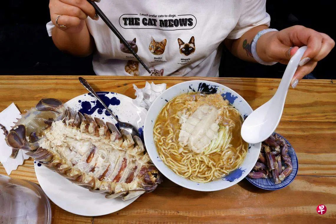 (台北路透电)一只长达20厘米、壳体完整的大王具足虫,盖在拉面之上——这碗5月22日在台湾人气拉面店推出,售价1480台币(65新元)的具足虫拉面,近来在台湾爆红,吸引众多食客排队预定尝鲜。