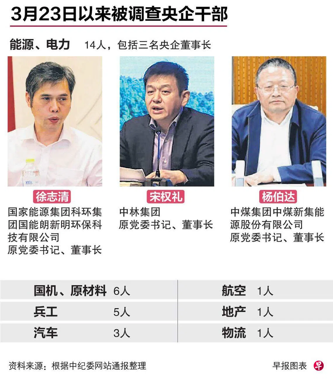 3月底以来被查的央企干部集中在能源、国机、兵工和汽车领域,也出现零星的航空、地产和物流领域反腐案例。