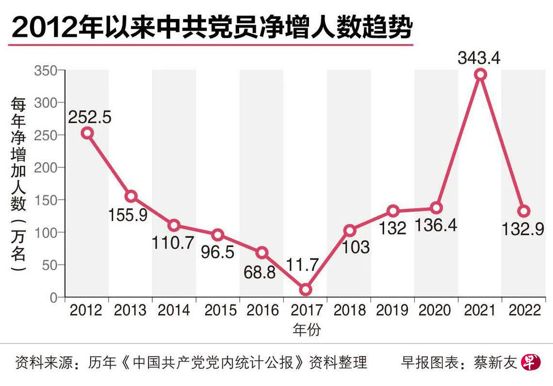 陆曦认为,2022年中共党员净增人数出现缩减迹象,“可能反映出党内整体氛围开始变化,类似的趋势在历史上是有迹可循的”。