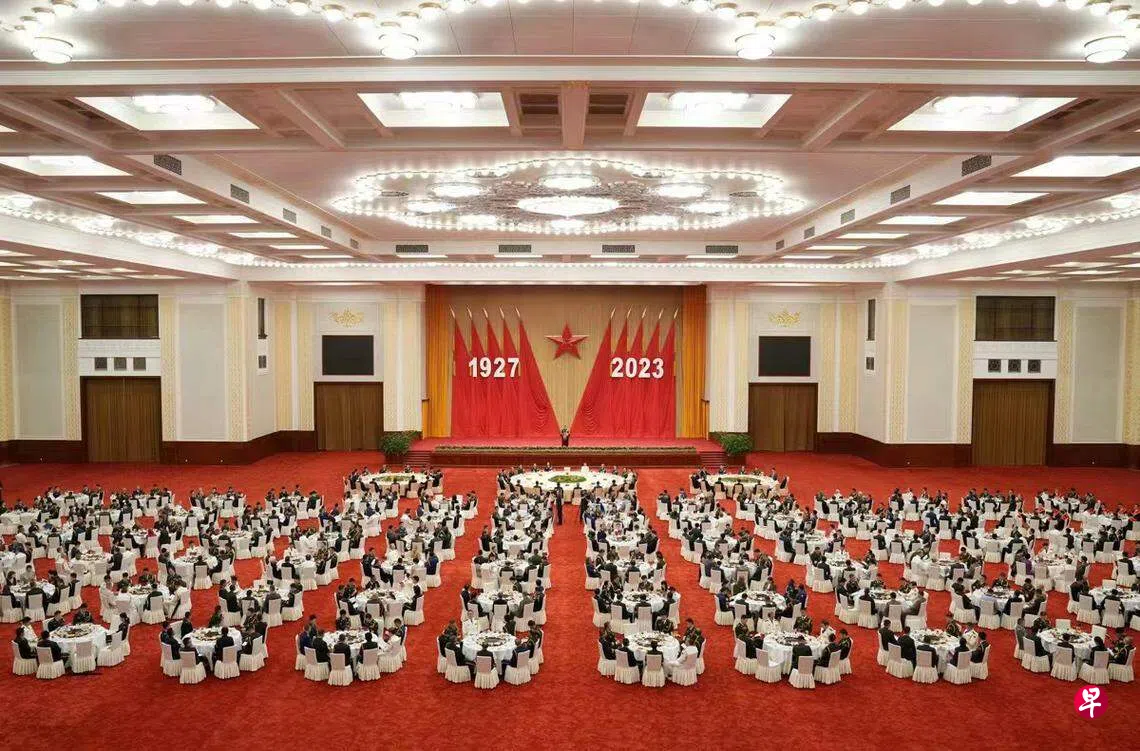 中国国防部星期一(7月31日)晚间在北京人民大会堂举行招待会庆祝建军96周年,是自中共二十大及中国冠病疫情之后的第一场盛大招待会。