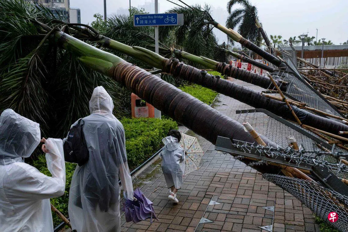 综合路透社、法新社报道,台风来袭后,香港街道上散落着倒下的树木,许多建筑招牌都被吹走,浅水湾海滩的水位也比正常水平高出几米,甚至部分淹没了其地标天后庙。香港无线电视(TVB)播出的画面显示,将军澳区一栋办公楼的大窗户被吹飞。