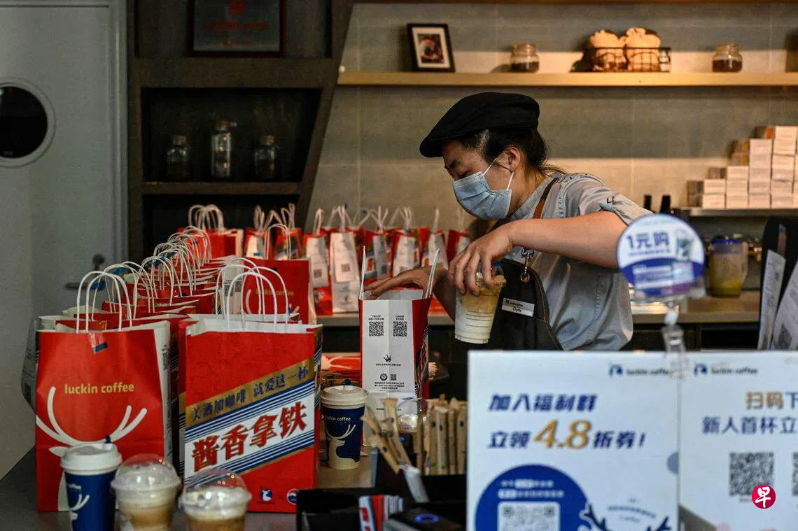 综合路透社和中新经纬报道,售价38元(人民币,下同,7新元)的酱香拿铁,星期一(9月4日)以半价19元开卖,号称“每一杯都含有贵州茅台酒”,迅速吸引消费者,外卖和自取订单都排起长队。