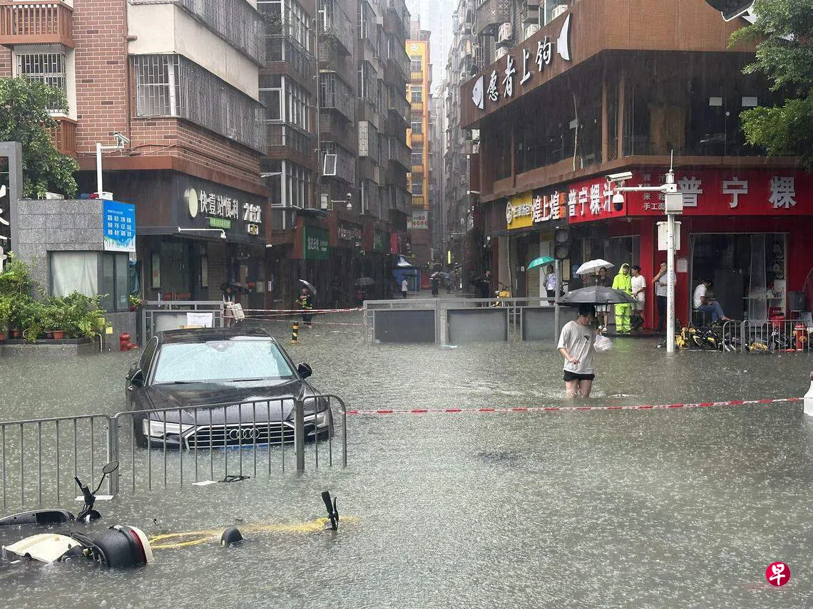 本报记者星期五上午走访福田区降雨量较高的地区时发现,降雨强度已稍为缓和,但一些路段的积水情况仍然严重,雨水完全淹没马路和人行道,水位高达成年人膝盖处。不少车子因为故障停在路中央,浸泡在水中。