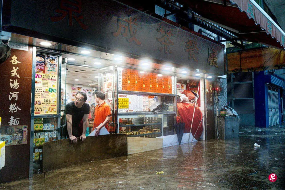 香港在星期四(9月7日)晚上录得每小时158.1 毫米的降雨量,是当地自1884年有记录以来的最高降雨量。雨势导致香港部分街道被淹,有茶餐厅店员竖起防洪挡水板,避免雨水倒灌进店内。