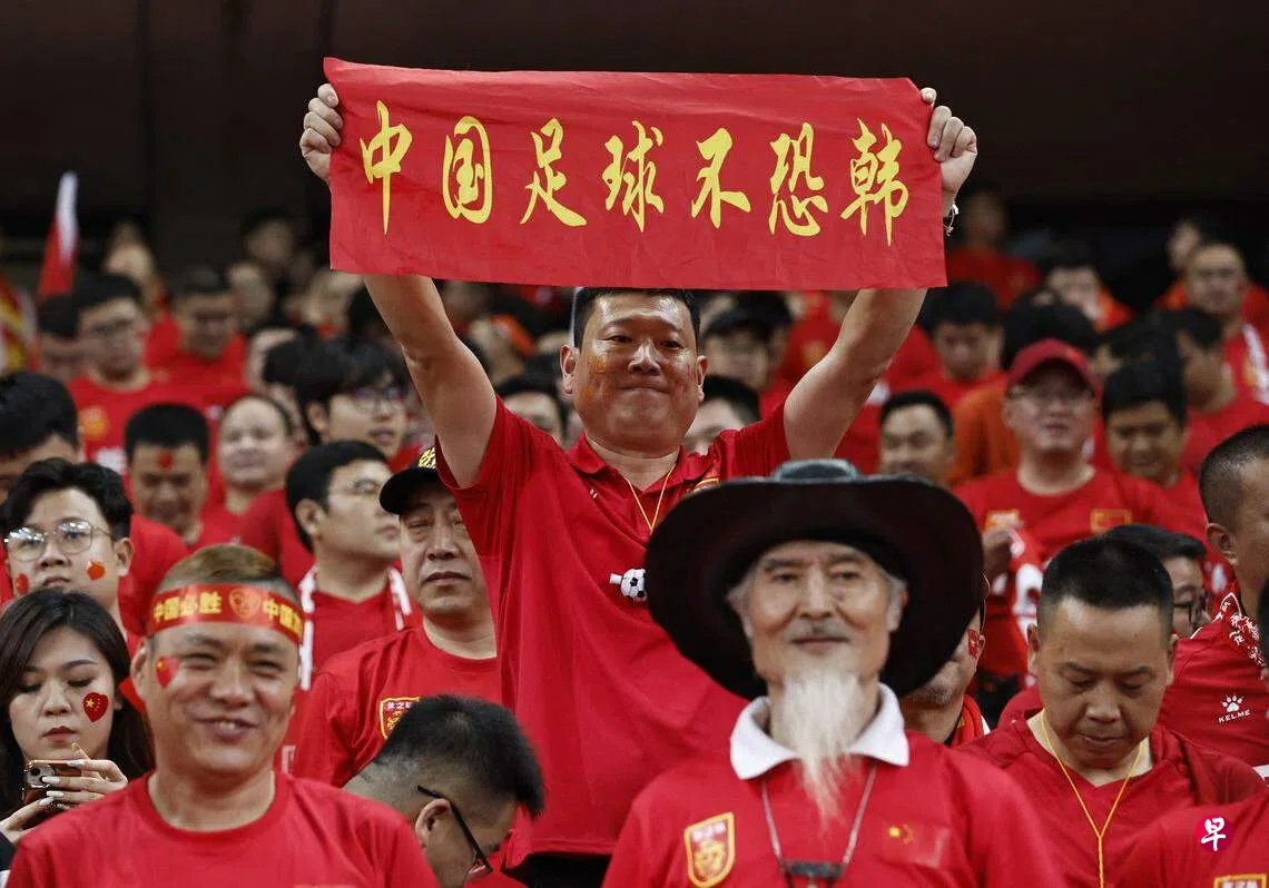 这是中国国足上星期四(11月17日)在曼谷以2比1击败泰国后的第二场预选赛。即便比赛是在工作日晚上举行,超过四万名来自中国各地的球迷在深圳观赛,为中国男足助威。