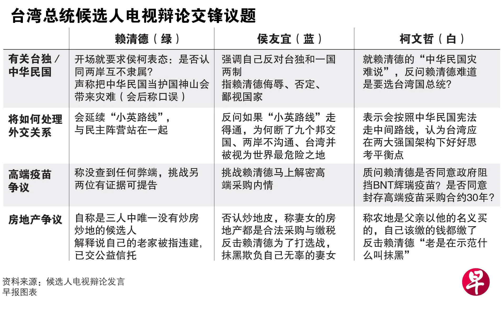 台湾总统候选人电视辩论会星期六(12月30日)登场,绿营民进党的赖清德、蓝营国民党的侯友宜,与白营民众党的柯文哲正面对决,针对两岸关系、疫苗采购合约和房地产争议激烈交锋。
