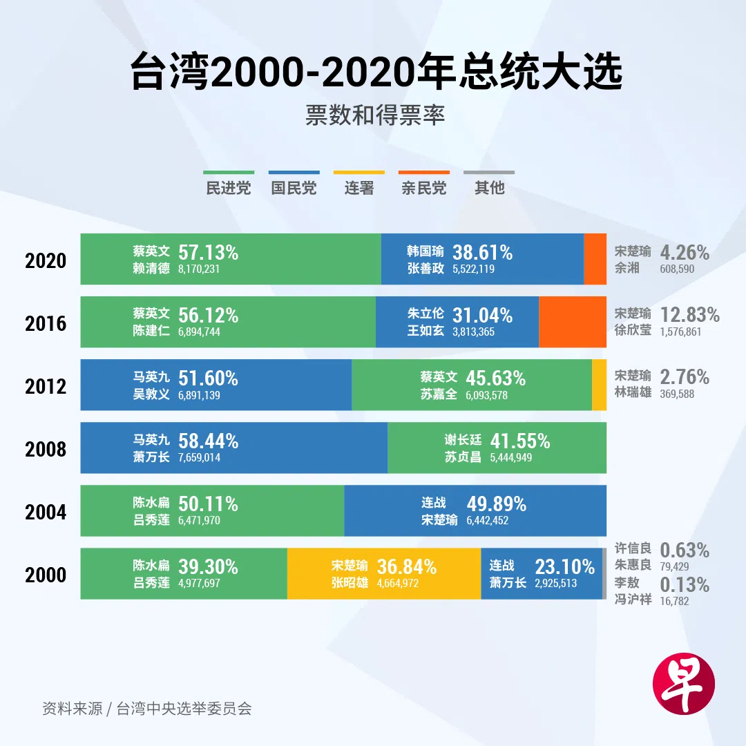 台湾历届总统和立委选举成绩发布/2024年1月1日 15:00小标准中大台湾将在1月13日举行总统和立委选举。《联合早报》依据台湾中央选举委员会网站数据,整理出从2000年至2020年的历届总统选举成绩,以及2016年和2020年的立委政党席次变化。 2024年台湾总统选举上一篇戴庆成:香港新一年机遇与挑战并存下一篇侯友宜再提蓝白合:六点共识仍适用 组联合政府势在必行购买此文章