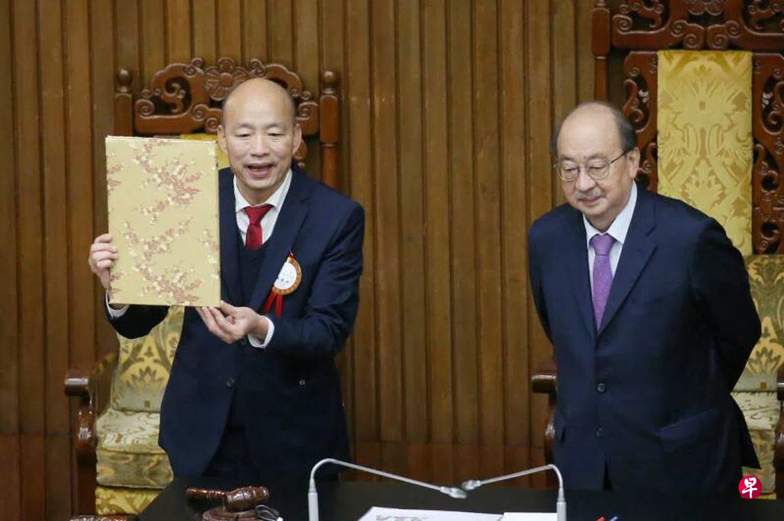 韩国瑜30年前曾担任立委。他说,在他残留的记忆里,立法院有时候像丛林,冲满阳刚之气甚至激情演出,全世界华人都在看台湾民主,期盼未来的立法院是讲理的地方。