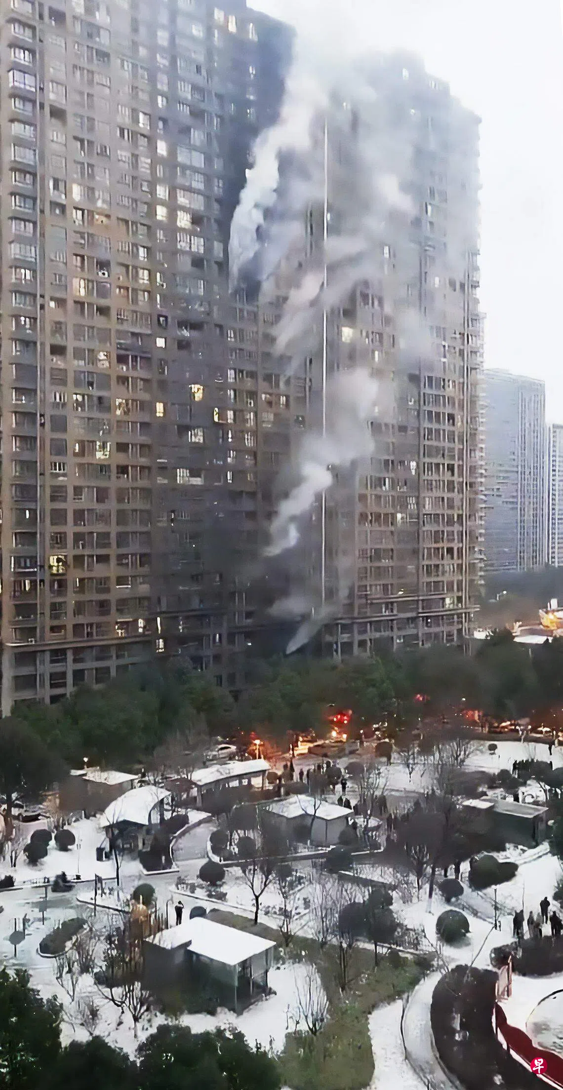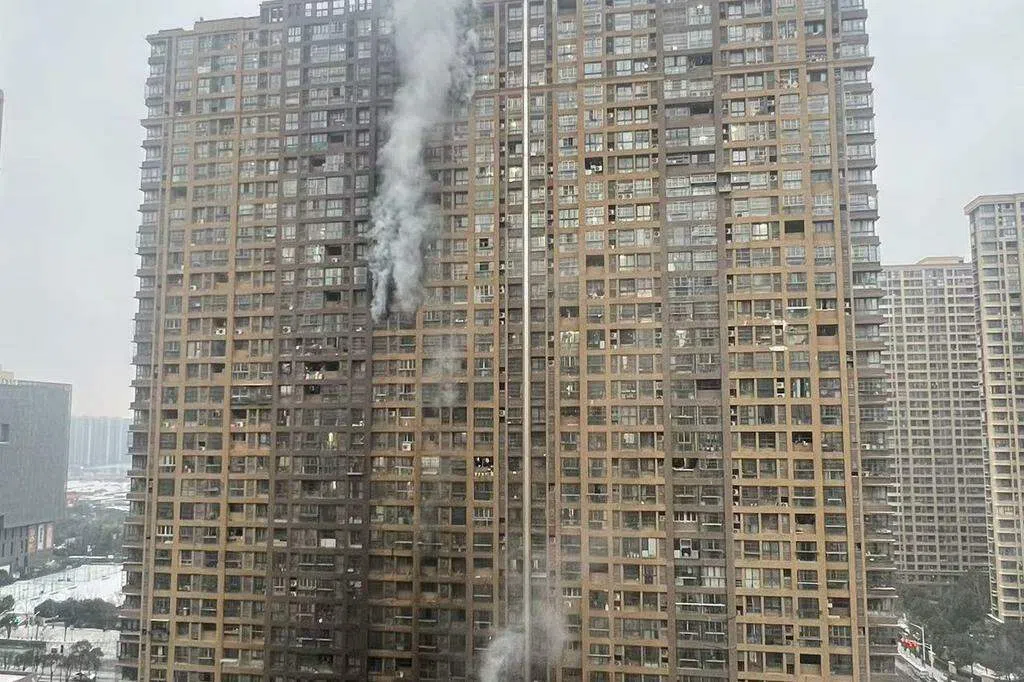 这栋居民楼高34层,建筑低楼层和高楼层的外墙被熏黑,多个楼层的防盗窗被烧得变形。网上流传的视频显示,一栋大楼的多个单位在黑夜中起火,有10多个楼层窜出浓烟烈焰,大楼底层也一片火海。目前不清楚为何会有多个单位起火,照片中也可见,到了白天,仍有单位窗口冒出浓烟。