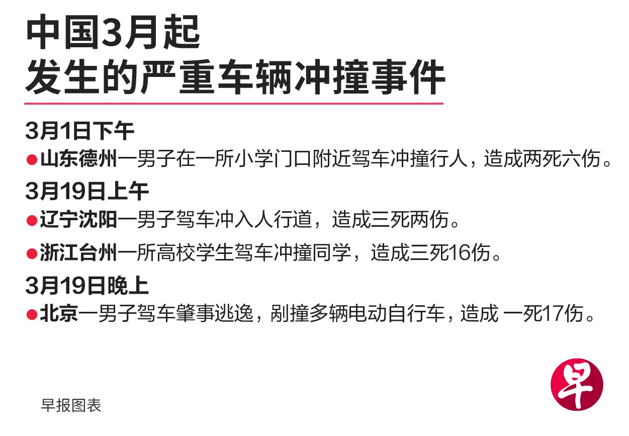 (北京/沈阳/台州/德州综合讯)中国辽宁省沈阳市、浙江省台州市,以及北京市在星期二(3月19日)接连发生严重车辆冲撞事件,共造成七人死亡,超过30人受伤。其中,北京的事故地点位在知名旅游景点附近。