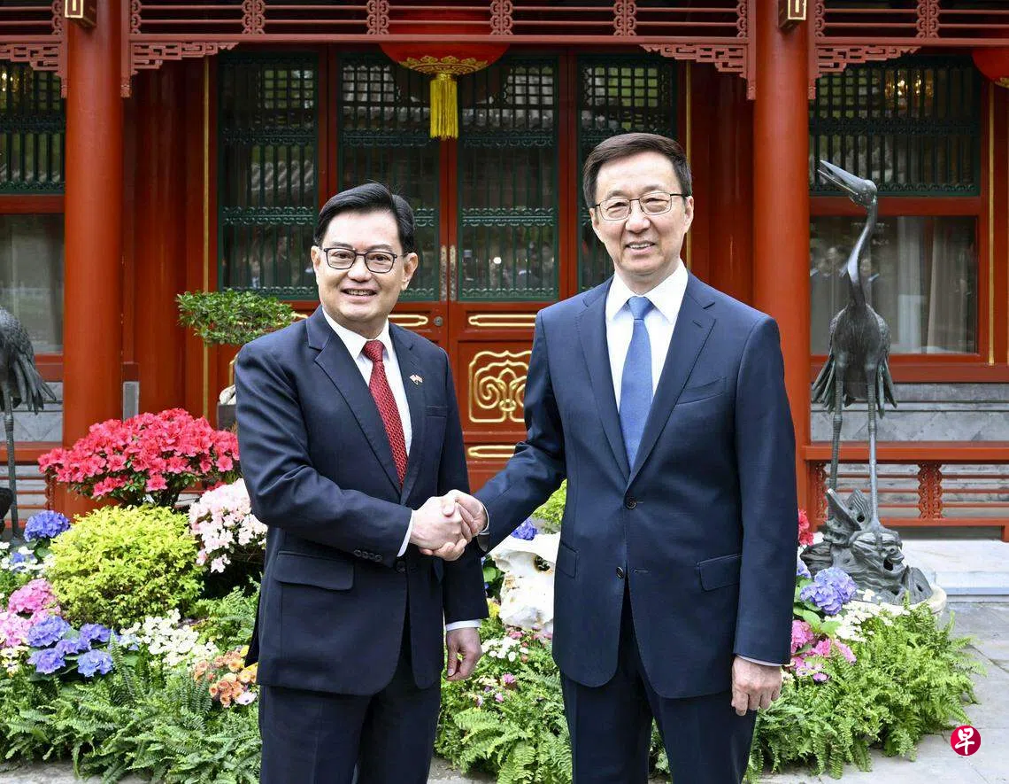 韩正则在去年11月首次以中国国家副主席身份访新,中共中央对外联络部部长刘建超3月底也访问了新加坡。