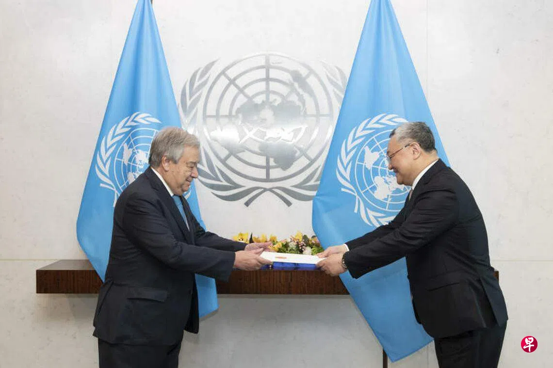 根据中国常驻联合国代表团网站的消息,傅聪星期二(4月16日)在美国纽约的联合国总部,向联合国秘书长古特雷斯递交了全权证书。