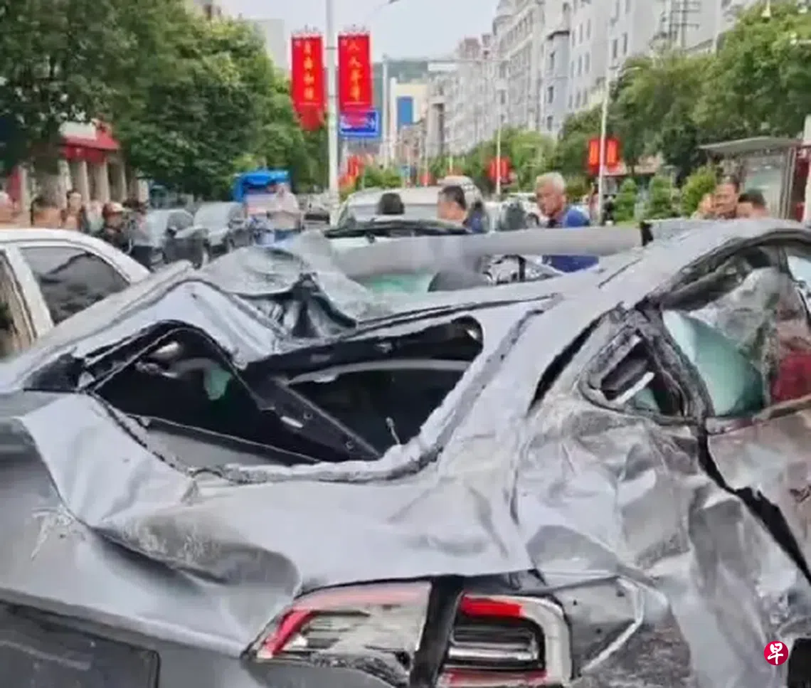 (赣州综合讯)中国江西一辆特斯拉电动汽车星期三(5月1日)在冲撞一排停放在路边的车辆后,在空中翻滚多次,事故造成四人受伤,九辆汽车受损。