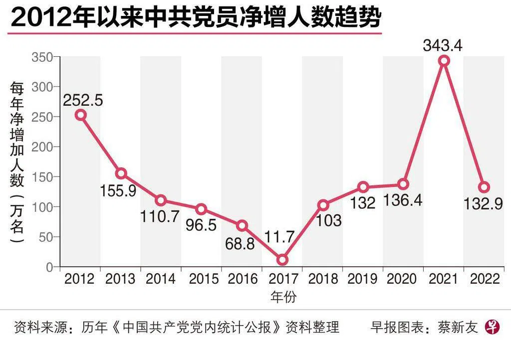 根据历年的《中国共产党党内统计公报》,中共党员净增人数2012年至2017年间逐年下滑,净增党员人数从252万5000名骤降至11万7000名。这个趋势在2018年以后扭转,净增党员人数逐年增加,从2018年的103万名,增至2020年的136万4000名,2021年中共建党百年那年进一步大增至343万4000名,2022年则回落至132万9000名。
