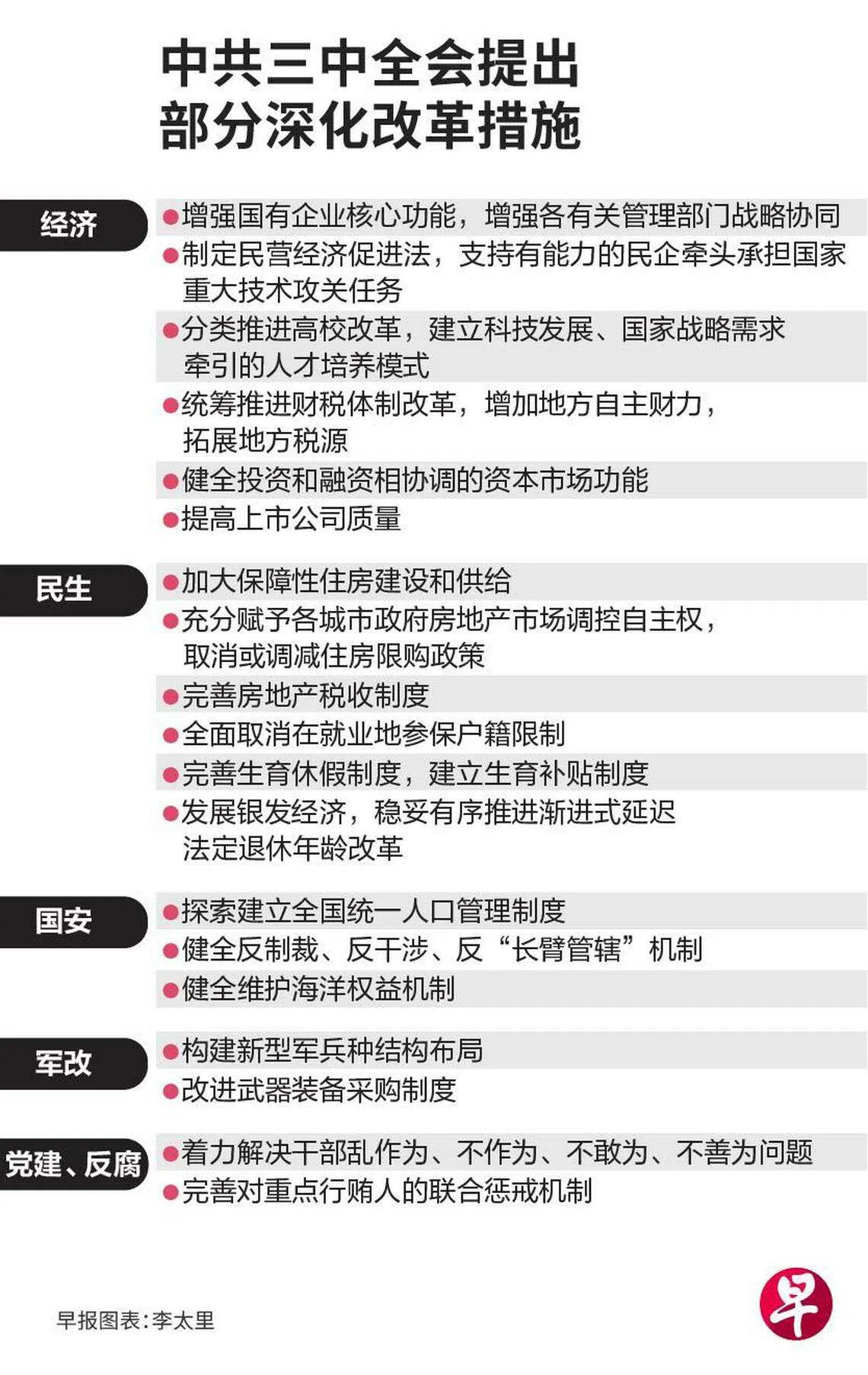 在健全保障和改善民生制度体系方面,《决定》提出的改革内容包括,完善收入分配制度;优化创业促进就业政策环境;全面取消在就业地参保户籍限制;建立生育补贴制度;发展银发经济,按照自愿、弹性原则,稳妥有序推进渐进式延迟法定退休年龄改革等。
