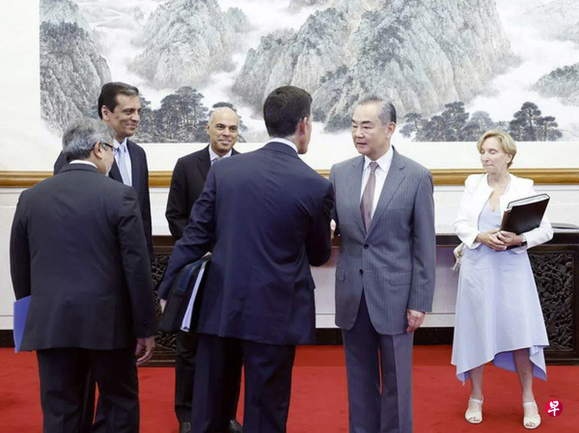 据中国外交部官网消息,王毅星期一(7月22日)在北京集体会见了美中贸易全国委员会董事会代表团,参加人员包括美中贸委会董事会主席芮思博、和睦家医疗创始人李碧菁、波音国际集团总裁纳尔逊、美中贸委会会长艾伦等。