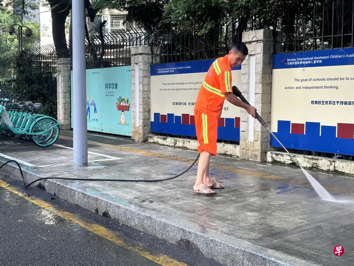 在案发现场,环卫人员正使用高压水枪清洗现场,但地面上仍隐约可见一些血迹。现场聚集了来自街道办、外事办及公安局的官员了解情况,气氛凝重紧张。