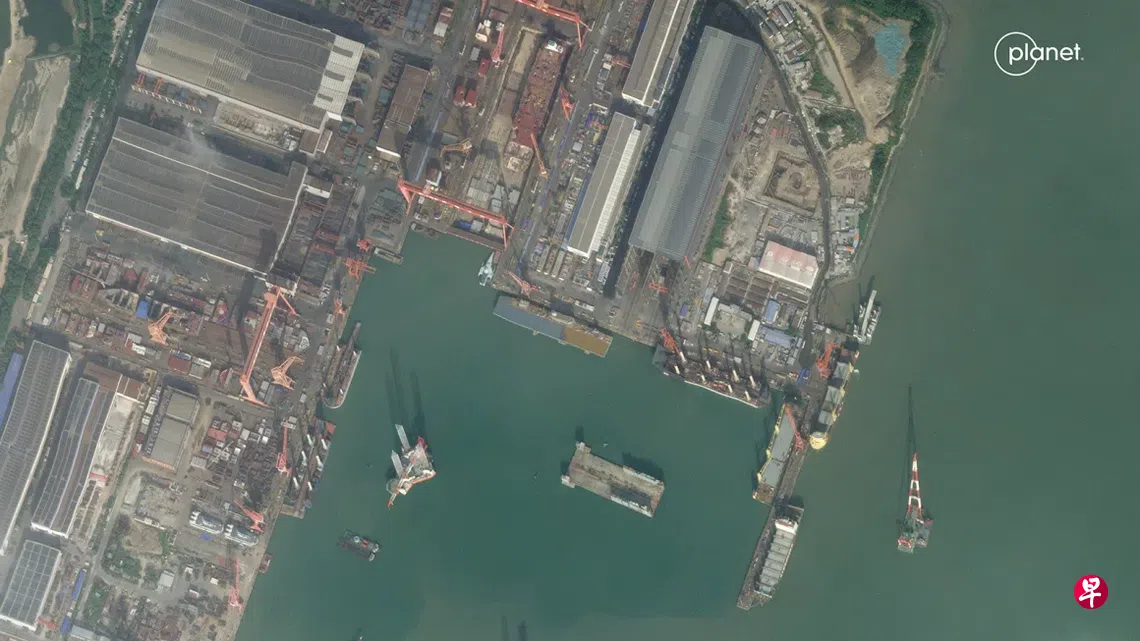 美国最新卫星图像显示,中国正在广东南部打造一艘大型开放平顶的船舰,疑为全球首艘军民两用的航空母舰,可能被用来提升海警监控能力。