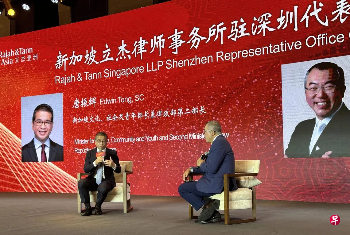 文化、社区及青年部部长兼律政部第二部长唐振辉,星期一(11月25日)在深圳出席新加坡立杰律师事务所驻深圳代表处开业活动时,就如何进一步推动中国与亚细安合作发表上述观点。这场活动吸引约300名来自中国法律和商务界的代表出席。