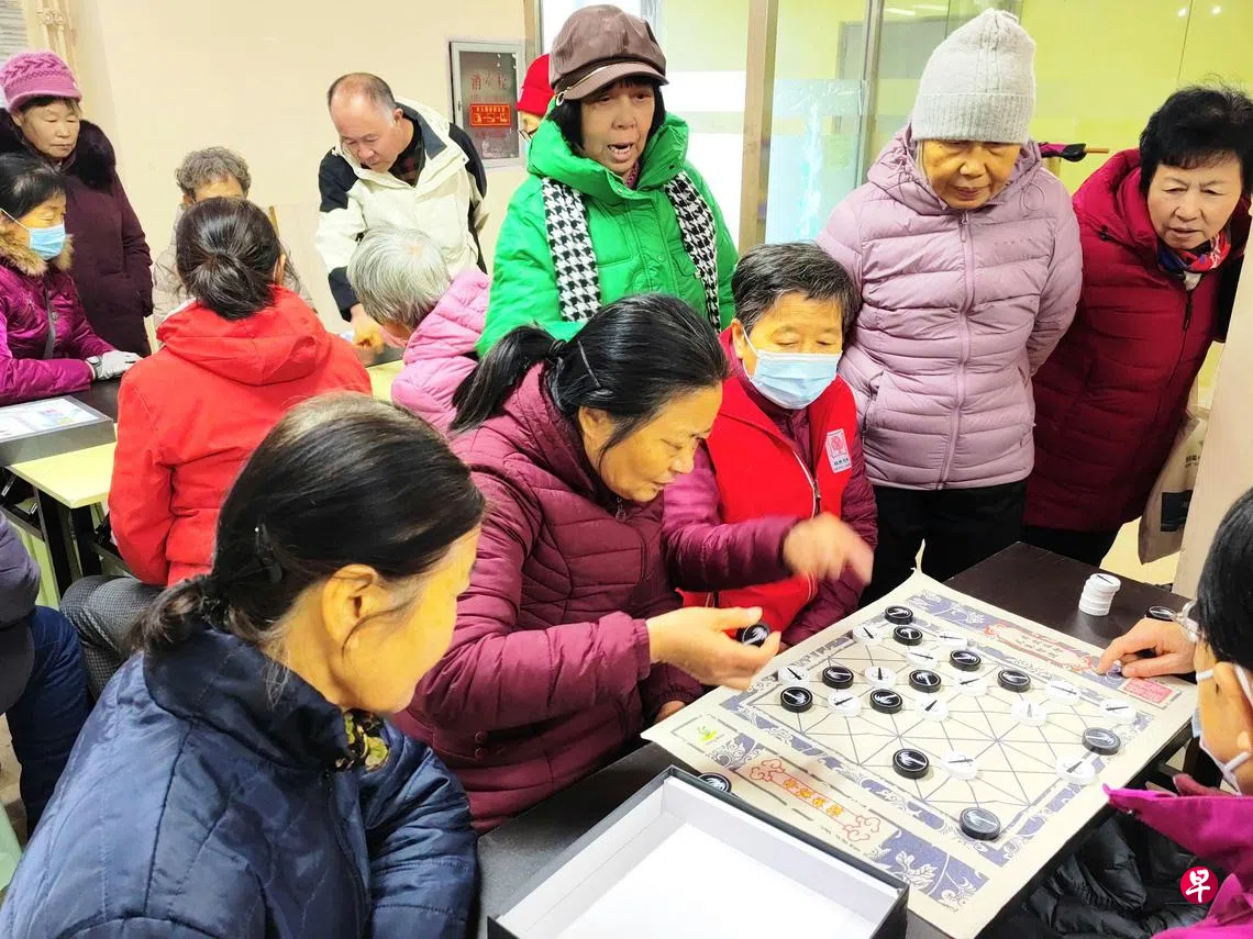 有人在游戏师指导下解锁烧脑的九连环(中国传统益智游戏);有的两人一组、四人一圈,围坐在花花绿绿、形状各异,叫不上名字的棋盘前专注对弈。老人们全神贯注,就像认真做功课的小学生。