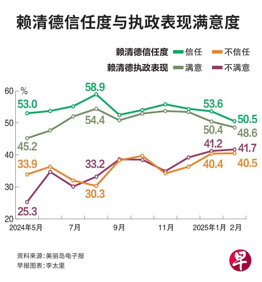 根据《美丽岛电子报》星期一(2月24日)公布的民调结果,民众对赖清德的信任度为50.5%,比上月少3.1个百分点,为就职以来新低;40.5%不信任,则比上个月微增0.1个百分点,达到就职以来新高。