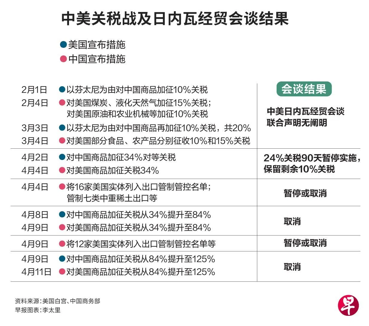 特朗普今年1月重返白宫后,以芬太尼走私问题和对等关税政策,将对华关税叠加至145%,北京则对美国商品施以125%的报复关税。彭博经济此前估计,高额关税将导致中美高达90%的双边贸易停顿。