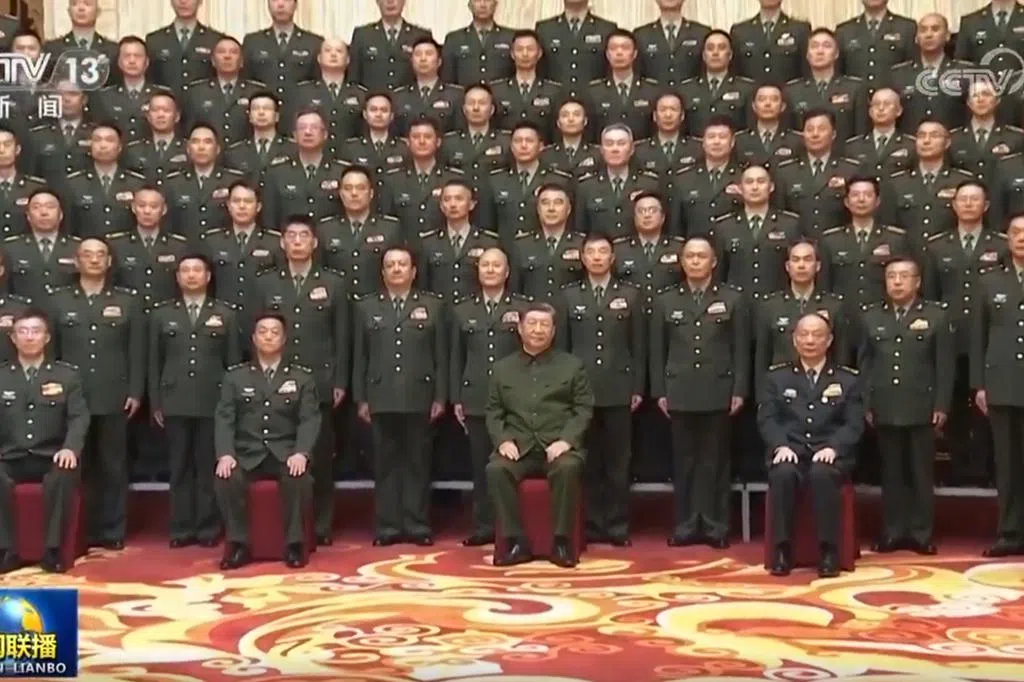 中国央视《新闻联播》画面显示,当天接见的全体合影,习近平坐在前排正中,他左手边为中央军委委员、军委联合参谋部参谋长刘振立上将,右边为陆军中将文东。合影中未见新疆军区政委杨诚中将和司令员柳林中将。