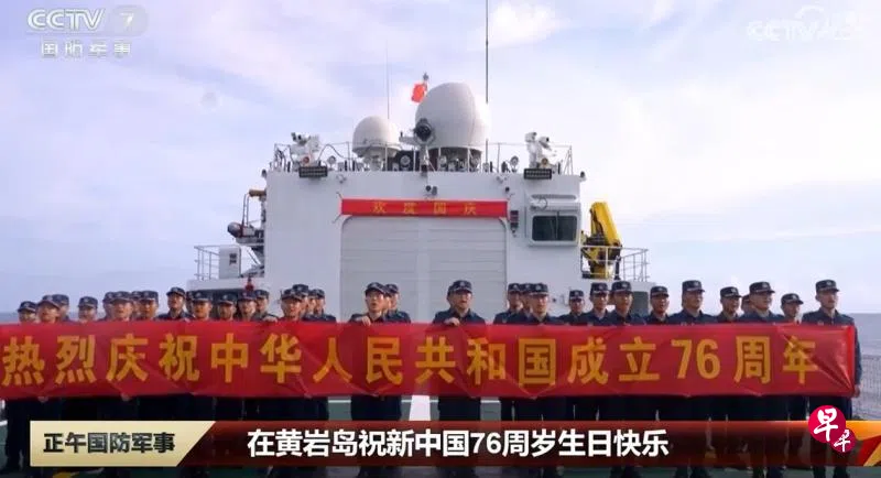 中国海警星期三(10月1日)在短视频平台抖音发布的视频显示,海警执法员在舷号3304的巡逻船达濠舰上列队敬礼,伴随中国国旗升起,高喊“海疆有我在,祖国请放心”的口号。