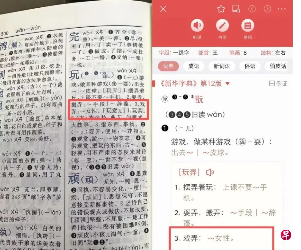 (北京综合讯)中国市面通行的第12版《新华字典》中,“玩”字的释义条目下,有示例为“戏弄:玩女性”,引起家长和网民质疑。