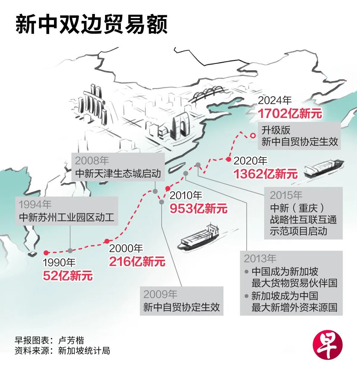 新加坡和中国建交35年来,双边贸易额增长逾30倍。两国在深化工业、贸易和金融等传统领域联系的同时,也探索在数码经济、绿色经济等新领域的合作机遇。