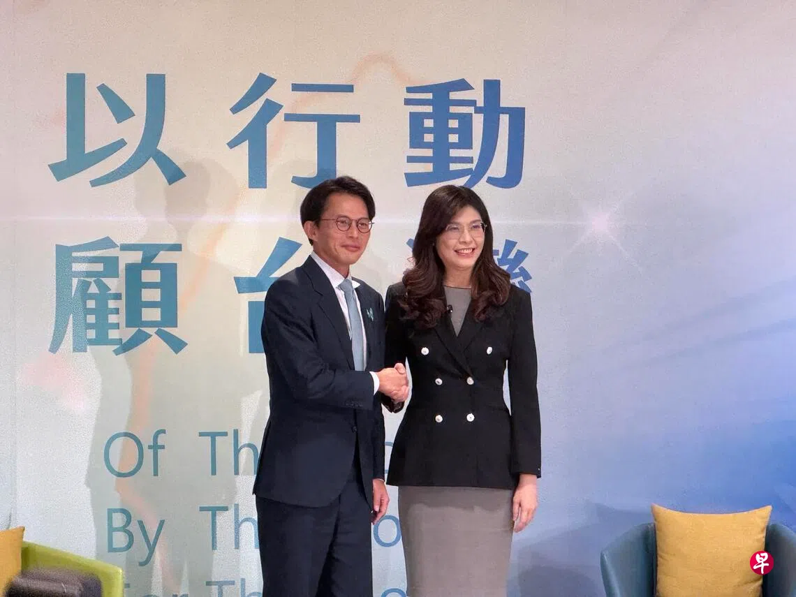 中国国民党(蓝)主席郑丽文与台湾民众党(白)主席黄国昌,星期三(11月19日)在新北市新庄凯悦嘉轩酒店举行“以行动顾台湾,主席高峰会谈”,双方各率四名党务主管与会,建立两党沟通联系管道。